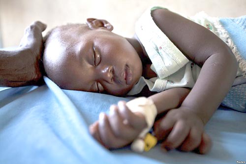 Một bé gái bị sốt rét nằm trong phòng bệnh của Trung tâm Chăm sóc sức khỏe ban đầu Malualkon