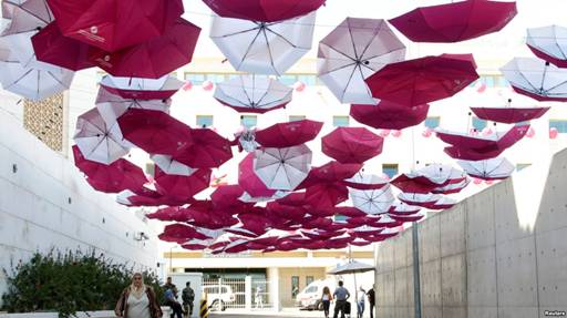 Một phụ nữ đi dưới tán ô dựng bên ngoài Bộ Y tế công cộng, một phần của chiến dịch nâng cao nhận thức phòng chống ung thư vú ở Beirut, Lebanon, ngày 30/9/2016 |