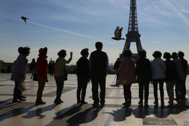 Du khách đang chụp hình lưu niệm tại Trocadero với Tháp Eiffel phía sau tại Parisngày 30/3/2017,khi Pháp đang phải gánh chịu các đợt nóng với nhiệt độ trên 220C ở một số vùng