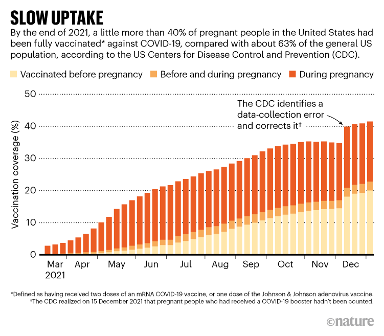 Nhưng dữ liệu hiện nay đã đáng tin cậy hơn. Những con số cho thấy rằng nguy cơ mắc COVID-19 trong suốt thai kỳ - bao gồm sức khoẻ bà mẹ, thai chết lưu và sinh non – còn nguy hiểm hơn rất nhiều so với là những nguy cơ từ việc tiêm vắc-xin. Và hơn nữa, theo dữ liệu từ CDC Hoa Kỳ, chỉ khoảng 40% phụ nữ có thai tại Hoa Kỳ đã được tiêm vắc-xin COVID-19 tính đến ngày 1 tháng 1 năm 2020 (xem ảnh dưới). Những con số tiêm vắc-xin này cũng thấp tương tự trên khắp toàn cầu – khiến cho những phụ nữ có thai bị bệnh tăng lên ở các bệnh viện, và các nhân viên y tế phải vật lộn để tìm ra các giải pháp khắc phục.