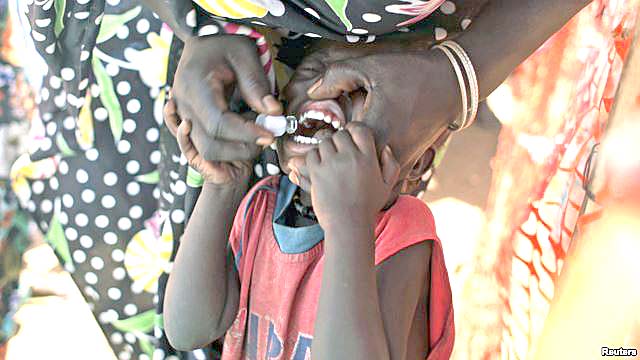 Một đứa trẻ tỵ nạn người Nam Sudan nhận được một liều vaccine tả uống trong một trại dành cho người di tản quốc tế trong sứ mệnh của Liên Hợp Quốc tại Nam Sudanở Tomping, Juba, tháng 2/2014