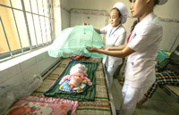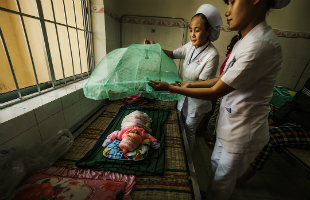 Nhân viên y tế đặt lưới muỗi trên một trẻ sơ sinh tại tỉnh Khánh Hòa , Việt Nam (WHO/Y.Shimizu)