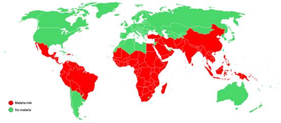 Gần một nửa dân số thế giới (khu vực màu đỏ trên bản đồ) có nguy cơ mắc bệnh sốt rét