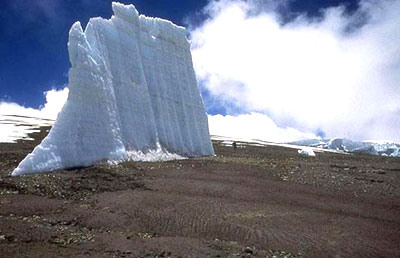 Mực nước biển dâng cao do băng tan: nhiệt độ trái đất ngày càng tăng, làm các tảng băng tan nhanh hơn, làm mực nước biển và đại dương tăng theo, các dòng sông băng trên thế giới đang dần bị thu hẹp. Bức ảnh dưới đây mô tả một tảng băng trơ trọi trên đỉnh Klimanjaro tại Tanzania bởi 80% diện tích băng ở đó đã biến mất trong 5 thập kỷ qua năm qua, theo lời Bộ trưởng Môi trường nước này: "Tác động của biến đổi khí hậu đối với Tanzania đang diễn ra với tốc độ khủng khiếp chưa từng có trong lịch sử".