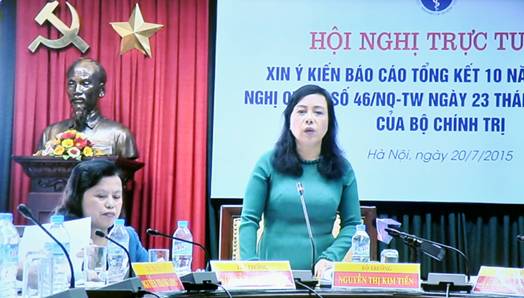 Theo Cổng thông tin điện tử Bộ Y tế (MoH), ngày 20/7/2015 Bộ Y tế tổ chức Hội nghị trực tuyến với 63 tỉnh/thành phố trong cả nước lấy ý kiến đóng góp dự thảo Báo cáo tổng kết 10 năm (2005-2015) thực hiện Nghị quyết 46/NQ-TW ngày 23/2/2005 của Bộ Chính trị về công tác bảo vệ, chăm sóc và nâng cao sức khỏe nhân dân trong tình hình mới.