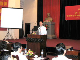 PGS.TS. Nguyễn Thị Kim Tiến-Bộ trưởng Bộ Y tế phát biểu chỉ đạo Hội nghị | ThS. Nguyễn Văn Tác-Vụ trưởng Vụ Tổ chức Cán bộ- Bộ Y tế phát biểu tại Hội nghị |