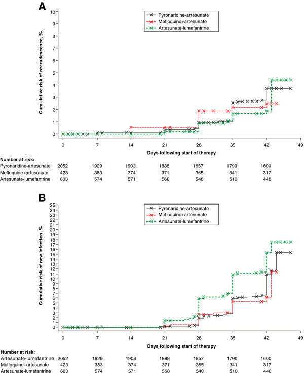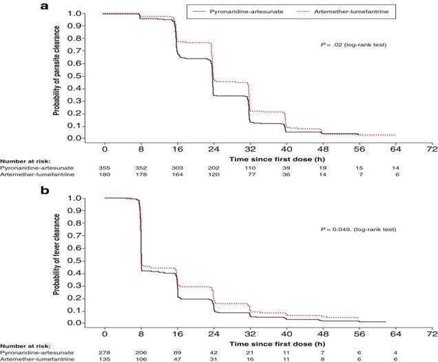 Tất cả bệnh nhân sạch KSTSR trước ngày thứ 4 và không tái phát trước ngày D39, khẳng định hiệu lực điều trị tốt đối với ký sinh trùng thể vô tính trong máu. Tái phát xảy ra trong số 9 ca (15%) và 7 ca (12%) đối tượng nghiên cứu tương ứng ở nhóm dùng PA hoặc DHA-PPQ, sử dụng thuật toán ước tính tỷ lệ hiệu quả điều trị chống tái phát là 94% và 95%. Không có biến cố bất lợi nào liên quan đến thuốc điều trị được báo cáo.