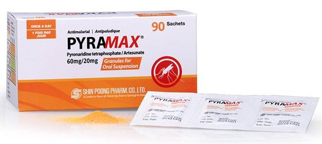 Pyramax là biệt dược của một loại thuốc sốt rét phối hợp có thành phần dẫn suất artemisinins (Artesunate+pyronaridine). Thuốc điều trị sốt rét này do hãng dược phẩm Shinpoong, Hàn Quốc sản xuất, thuốc đóng dạng viên nén bao phin, hình tròn, màu cam, có 2 hoạt chất chống sốt rét là pyronaridin tetraphosphat 180 mg và artesunat 60 mg. Ngoài ra, một số thành phần khác đi kèm và tá dược gồm cellulose vi tinh thể M102 (70 mg), crospovidon (65 mg), mannitol (60 mg), magnesi stearat (6 mg), bột talc (15 mg), hypromellose 2910 (20 mg), macrogol 6000 (4 mg), opadry OY-S-23068 cam (20 mg).