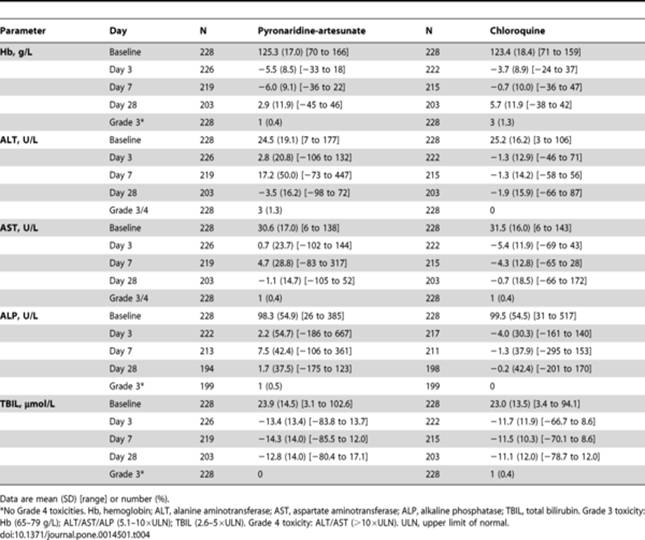 Trong cả 2 nhóm nghiên cứu, không có thay đổi về huyết học có ý nghĩa lâm sàng và sự thay đổi không có sự khác biệtgiữa các nhóm điều trị. Về sinh hóa: Nhóm uống PA có 15 bệnh nhân có tăng ALTnhiều hơn 5 lầngiới hạn trên của giá trị bình thường). Trong số 15 người này có 2 bệnh nhân nam người lớn có men gan ALT tăng gấp 3 lần so với ngưỡng và bilirubin toàn phần tăng gấp 2 lần so với ngưỡng (trong đó 1 bệnh nhân ngay ngày đầu (trước liều) đã có ALT tăng gấp 2 lần so với ngưỡng bình thường. Không có bệnh nhân nào có các dấu hiệu hoặc triệu chứng của rối loạn chức năng gan. Các chỉ số sinh hóa khác ở 2 nhóm uống PA và MA như nhau.