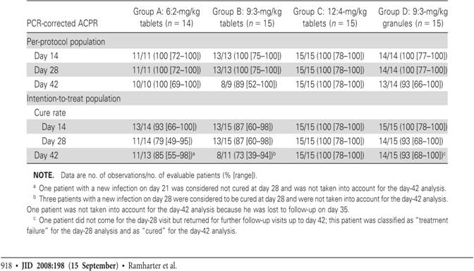 Mặc dù nghiên cứu có mẫu nhỏ, sự kết hợp thuốc cho thấy một kết quả hứa hẹn về hiệu quả điều trị ở tất cả các liều và với hai dạng sử dụng là 100% ACPR đã hiệu chỉnh PCRvào ngày D28 tại tất cả 4 nhóm điều trị (cho mỗi dạng sử dụng được phân tích). ACPR đã hiệu chỉnh PCR vào ngày D42 là 100% trong nhóm dùng viên kết hợp 6:2 mg/kg và 12:4 mg/kg, 88,9% nhóm 9:3 mg/kg và 92,9% vớinhóm dạng hạt 9:3 mg/kg. Trong tất cả nhóm điều trị, thời gian cắt sốt và sạch ký sinh trùng đều nhanh. Thời gian trung bình sạch ký sinh trùng thay đổi như sau: 16.4 giờ (viên 6:2 mg/kg), 16.1 giờ (viên 9:3 mg /kg), 8.1 giờ (viên 12:4 mg/kg) và 8.3 giờ (9:3 mg/kg).