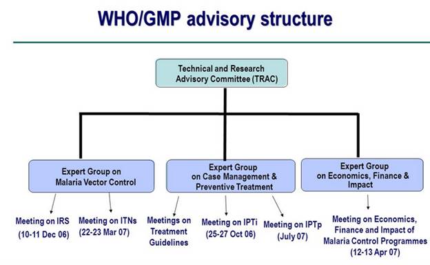 Chiến lược này là kết quả của một quá trình tư vấn rộng rãi kéo dài 2 năm và có sự tham gia của hơn 400 chuyên gia kỹ thuật từ 70 quốc gia thành viên. Chương trình Sốt rét toàn cầu của TCYTTG (WHO/GMP) điều phối các nỗ lực toàn cầu của TCYTTG về phòng chống và loại trừ bệnh sốt rét bằng cách: