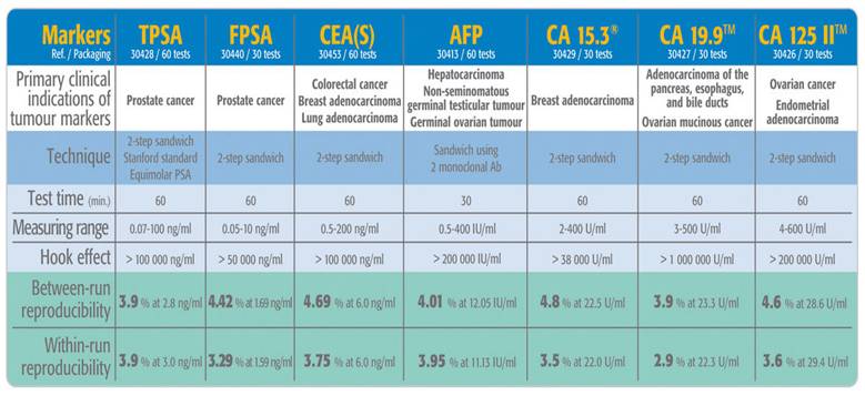 2 | CEA (2) Carcino- embryonic antigen) | Phổi, đại tràng, vú và tuỵ | 0,17-4,26 ng/ml | Người BT 5 ng/ml. (5) |