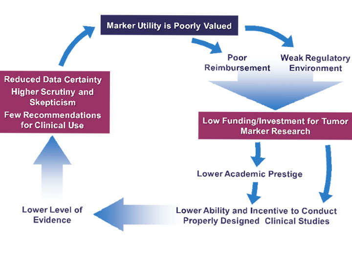 Hiện nay, chưa có chất chỉ điểm khối u lý tưởng có đầy đủ 100% tiêu chuẩn về độ nhạy, độ đặc hiệu, độ tin cậy chắc chắn, tính đặc hiệu cơ quan và chẩn đoán chính xác giai đoạn bệnh. Tuy nhiên, một loại chỉ điểm khối u có những giá trị trên các tiêu chuẩn khác nhau và khi phối hợp 2 hay nhiều thử nghiệm lại, kết hợp với triệu chứng trên lâm sàng sẽ thêm giá trị bổ sung chẩn đoán. PSA, PAP’s và thyroglobulin là những chất chỉ điểm đặc hiệu cho cơ quan có u.