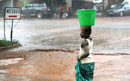 | Một phụ nữ đội xô nước trên đầu trên đường phố thủ đô Bamako trong mùa mưa ở Mali(Andrew Aitchison/Corbis via Getty Images) |