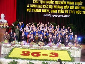 Chủ tịch Nguyễn Minh Triết: Vấn đề này có vô vàn những trang sách đã đặt vấn đề và đã phân tích kỹ. Đặc biệt, Chủ tịch Hồ Chí Minh đã có câu nói bất hủ: "Đất nước ta thịnh hay suy là phần lớn nhờ công của thanh niên". Đảng, Nhà nước và nhân dân ta lúc nào cũng xem trọng vai trò vị trí của thanh niên và đánh giá cao sự cống hiến của thanh niên và tạo những điều kiện thuận lợi nhất để thanh niên lập thân, lập nghiệp. Tôi xin khẳng định với với các đồng chí và các bạn thanh niên là không có gì thay đổi. Càng ngày niềm tin đó càng khẳng định hơn nữa là thanh niên là rường cột của nước nhà, là tương lai của đất nước, là người xây dựng xã hội ở Việt Nam đàng hoàng hơn, to đẹp hơn nhưng đồng thời bên cạnh đó, tôi nhắc nhở thanh niên phải học tập, phải rèn luyện, phải phấn đấu, phải sống sao cho xứng đáng niềm tin yêu của Đảng, của Nhà nước.Xin chúc các em vững bước tiến lên và mọi sự thành công đang chờ ở phía trước. |