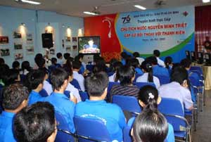 ngay từ 7 giờ sáng đã có hàng trăm bạn chờ đợi buổi truyền hình trực tiếp cuộc giao lưu giữa Chủ tịch nước với thanh niên. Tới 7h30 thì toàn bộ hội trường đã kín chỗ. Bảo, một đoàn viên ở phường 10 quận 5 cho biết bạn rất nôn nao vì mấy ngày hôm nay nghe báo đài đăng tải về sự kiện này. Theo Bảo, việc Chủ tịch nước giao lưu với thanh niên bây giờ tạo sự khuyến khích và thể hiện sự chăm lo của lãnh đạo, của Đảng, Nhà nước đối với thế hệ trẻ.Không chỉ chú ý lắng nghe những diễn biến trên màn hình, có nhiều bạn trẻ đã chăm chú ghi lại những câu hỏi và đặc biệt là những lời chia sẻ giao lưu của Chủ tịch nước. Nhiều bạn hồi hộp mong muốn chương trình dành một chút thời gian cho những bạn trẻ ở đầu cầu TP.HCM có dịp gởi tâm tư nguyện vọng đến với Chủ tịch nước. Thành Đoàn, NVH Thanh Niên đã vận dụng tối ưu cơ sở vật chất sẵn có của mình cho các bạn trẻ tham gia chương trình này. 2 màn hình lớn 54 inches và 29 inches cùng 15 máy vi tính với đường truyền tốc độ cao được đặt tại sảnh NVH Thanh Niên.