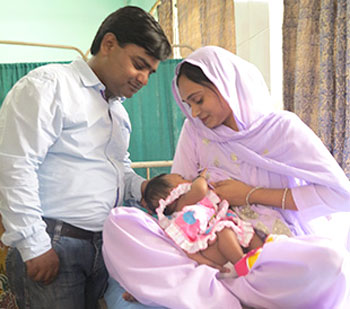 | Firdosh với gia đình và y tá cho trẻ bú tại bệnh viện GTB |