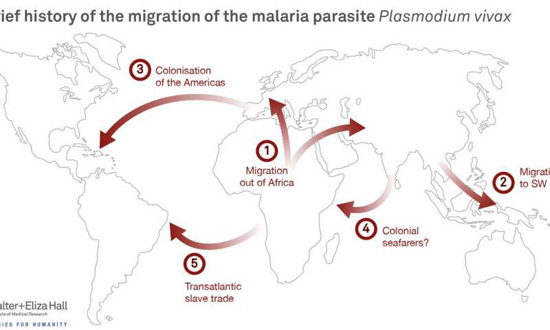 | Sự di chuyển trong quá khứ của ký sinh trùng sốt rét P.vivax. Ảnh: Viện Walter và Eliza Hall |