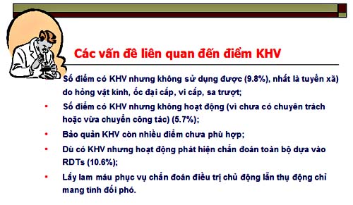 -Đánh giá sơ bộ về điểm KHV theo chuẩn của đoàn giám sát thì điểm KHV chỉ ở mức khá. Công tác lấy lam máu chủ động và thụ động có nhưng không thường xuyên, ngay cả bệnh nhân có sốt đến khám và điều trị, đôi khi không lấy lam; chuyên trách cho điểm kính vì không chỉ phụ trách mỗi chương trình sốt rét mà còn nhiều chương trình y tế quốc gia khác, thường xuyên đi tập huấn, học tập, ốm đau, sinh đẻ,…nên công tác XN đôi lúc không đảm bảo;