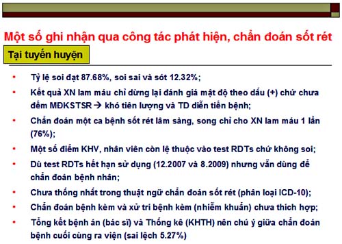 -Điểm cuối cùng cho các tuyến được kiểm tra chính là phần lớn số ca chẩn đoán sốt rét lâm sàng những bệnh nhân cũng chỉ được chỉ định làm xét nghiệm lam máu có 1 lần duy nhất rồi kết luận, rồi cho thuốc chứ không làm nhiều lần theo khuyến cáo.