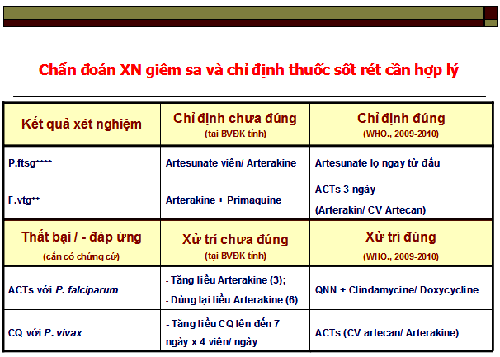 -Cần sửa chữa và thực hành lâm sàng điều trị sốt rét theo đúng phác đồ của Bộ Y tế khi sốt rét xác định là do P.falciparum và P.vivax về các thuốc CV Artecan, Chloroquine hay Primaquine, không tự ý chuyển đổi phác đồ theo “kinh nghiệm điều trị” của mỗi cá nhân thầy thuốc lâm sàng. Không nên lạm dụng nhiều thuốc Artesunate (dạng tiêm) vì artesunate lọ cũng là dạng thuốc đơn trị liệu, chỉ định dùng thận trọng và khi thật cần thiết, chú ý liều aartesunate tiêm và thời điểm chỉ định nên tuân thủ theo phác đồ mới 2009;