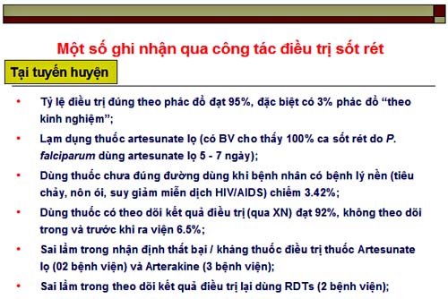 -Nhìn chung, điều trị tại các tuyến là đúng phác đồ và hướng dẫn cũng như quy định của Bộ Y tế, dùng thuốc điều trị thể vô tính bằng các phác đồ thuốc hiệu lực cao, thuốc điều trị tiệt căn và diệt giao bào chống lây lan đầy đủ. Song, một số cán bộ điều trị vẫn còn nhầm lẫn phác đồ điều trị sốt rét do P.vivax như cho thuốc Chloroquine 3 ngày 4 v: 4 v: 4 v, rồi sau đó cho Primaquine 2 viên/ ngày x 3 ngày (nhưng qui định 4 viên/ ngày x 10 ngày) hoặc dùng nhầm phác đồ CV-Artecan (4 v: 4 v : 2 v) trên 4 bệnh án; hoặc dùng thuốc Artesunate (lọ) không đúng chỉ định trong một số trường hợp sốt rét thường và gần 95% số ca lạm dụng thuốc Artesunate lọ hoặc tự ý dùng tăng liều 3 lọ Artesunate lọ trong ngày đầu tiên; hoặc đổi phác đồ từ Artesunate lọ sang dùng Quinine (3 ngày); hoặc sốt rét do P.vivax lại cho dùng Artesunate mà không có lý giải cụ thể. Các phác đồ sai thường rơi vào cán bộ điều trị mới chuyển về hoặc cán bộ làm rất lâu năm nhưng không cập nhật phác đồ mới theo từng giai đoạn cho phù hợp với tình hình đáp ứng thuốc của KSTSR;