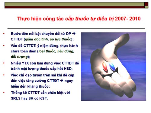 -Có nhiều tỉnh, tuyến xã đều nắm vững thuật ngữ “cấp thuốc tự điều trị” và thực hành đúng, tuy nhiên không phải trường hợp cấp thuốc tự điều trị nào cũng kiểm soát được, điều này dẫn đến khó kiểm soát và dùng thuốc không phù hợp hay không là vấn đề cần có những quy định rõ ràng đẻ tránh một số hậu quả về sau. Nhiều xã nắm được tình hình dân di biến động cũng như số dân di cư tự do nên cấp thuốc tự điều trị hiệu quả, song có nơi chưa thể;