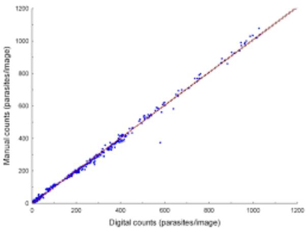 Một quy trình tính toán chính xác đã được phát triển mà không đỏi hỏi những quyết định từ người vận hành mà có thể gây nên những kết quả sai lệch. Phương pháp tính toán kỹ thuật số có tương quan rất lớn với tính toán thủ công đối với mật độ ký sinh trùng trung bình và cao, và có tương quan ít hơn một chút với phương pháp tính toán theo quy ước. Với mật độ thấp (ít hơn 6 ký sinh trùng trên 1 ảnh được phân tích) tỷ lệ tín hiệu/ âm thanh được dàn xếp và sự tương quan giữa tính toán kỹ thuật số và tính toán thủ công rất kém. Phương pháp tính toán theo quy ước thường luôn thấp hơn cả 2 phương pháp kỹ thuật số và thủ công.