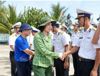 Thứ trưởng Nguyễn Thị Liên Hương và các thành viên hỏi thăm cán bộ chiến sĩ, nhân dân trên đảo đoàn đến thăm.