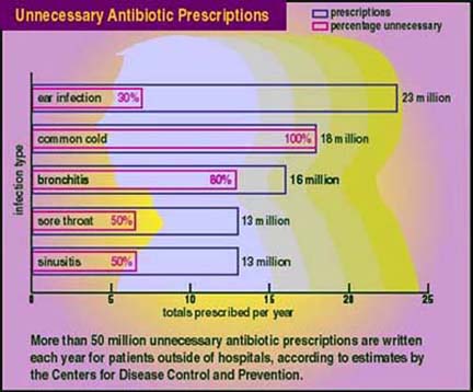 Khoa Nhi bệnh viện Bạch Mai - Hà Nội, nơi mà một ngày phải tiếp nhận hàng chục lượt bệnh nhân, trong đó không ít bệnh nhân nhập viện trong tình trạng nặng, kháng sinh đã không có tác dụng điều trị. Theo điều tra trong 18 bệnh viện huyện ở miền Bắc về mức độ sử dụng kháng sinh, thì 100% trẻ bị ho, sốt được điều trị bằng kháng sinh, trong khi chỉ 1/3 trong số đó là thực sự cần thiết. Như vậy mức lạm dụng kháng sinh là 2/3.