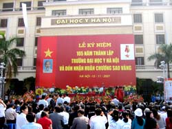Trong những ngày tháng 11 đầy ý nghĩa với giáo viên và sinh viên cả nước đang sôi nổi thi đua lập thành tích thiết thực chào mừng ngày nhà giáo Việt Nam 20-11, hôm nay, tại Thủ đô Hà Nội, Trường Đại Học Y Hà Nội long trọng tổ chức lễ kỷ niệm 105 năm thành lập Trường và đón nhận Huân chương Sao Vàng, Huân chương cao quý nhất của Đảng và Nhà nước. Đây là sự ghi nhận và đánh giá xứng đáng của Đảng, Nhà nước đối với những thành tích xuất sắc, những đóng góp quan trọng của Nhà Trường, sự cống hiến và lao động sáng tạo của tập thể các nhà giáo, giáo sư, bác sĩ và cán bộ, công chức, viên chức toàn trường trong suốt quá trình phấn đấu liên tục 105 năm qua.