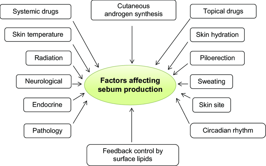 Hơn nữa, một số yếu tố có thể ảnh hưởng lên quá trình sinh chất nhờn như thuốc dùng đường toàn thân, sinh tổng hợp androgen dưới da, thuốc thoa ngoài da, nhiệt độ trên da, tia xạ, tâm thần kinh, nội tiết tố, bệnh lý, trạng thái giữ nước hay quá trình chúng ta cấp nước và cấp ẩm cho da (skin hydration), tiết mồ hôi, vị trí của da, nhịp sinh học hàng ngày (circadian rhythm), kiểm soát đối phó từ lượng lipid trên bề mặt da, phản ứng tự nhiên từ hệ thống thần kinh giao cảm và được gợi ra bởi cảm giác lạnh, sợ hãi hoặc trải nghiệm giật mình (piloerection).