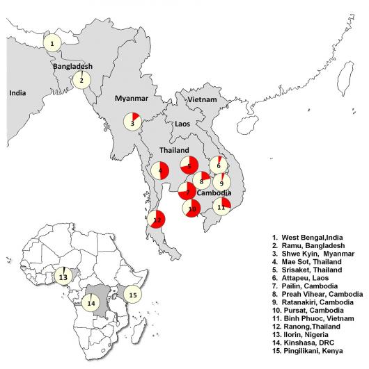 Hiện nay, với số liệu và bằng chứng phân tích trên các thử nghiệm in vivo, in vitro với tỷ lệ ký sinh trùng thể vô tính sau 3 ngày điều trị trên 10%, tăng nồng độ ức chế tối thiểu và sinh học phân tử đã phát hiện các đột biến phân tử K13 propeller liên quan đến xác định kháng thuốc hoặc có liên quan kháng thuốc do artemisinins và thuốc phối hợp ACTs tại nhiều quốc gia trên thế giới cả Đông Nam châu Á (Campuchia, Myanmar, Việt Nam, Thái Lan, Lào, Bangladesh, Ấn Độ) sang châu Phi (Kenya, Congo,…).