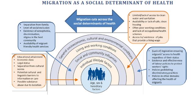 Liên quan đến quàn thể dân di biến động và sốt rét (Population Mobility and Malaria) cho thấy thế giới hiện nay đang trên toàn cầu hóa với xu hướng dân di chuyển có thể trong phạm vi toàn cầu. Ước tínhcó 214 triệu người di dân quốc tế, cùng với 740 triệu người di dân nội địa. Sự gia tăng một lượng lớn dân di biến động đa phương đã khiến cho tình hình trở nên phức tạp trong việc quản lý về mặt sức khỏe toàn cầu, ngay cả trước, trong và sau khi họ trở về. Vì xã hội vốn đa dạng về mặt văn hóa dân tộc, nên khía cạnh sức khỏe ở nhóm dân di biến động thường được xác định bởi các yếu tố bên ngoài lĩnh vực y tế. MMPs đối mặ nhiều thách thức tỏng việc tiếp cận công bằng các dịch vụ y tế như điều kiện sống và làm việc, trình độ dân trí, giới tính, tình trạng di dân thường xuyên hay không, thiếu các chính sách chăm sóc cho nhóm MMPs. Do vậy, dân di biến động được xem là một yếu tố xã hội (social determinant) của sức khỏe trên nhóm MMPs.