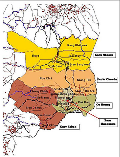 Ba con sông chảy ngang qua tỉnh là Srepok, Preaek Chhbaar, Preaek te Rivers. Cách thủ đô Phnom Penh khoảng 390 km. Hơn 80% dân số Mondulkiri là dân tộc bộ lạc (tribal minorities), với phần lớn là dân Pnong. Số còn lại 20% là Khmer, Trung Hoa, Muslims Cham. Dân cư ở đây cũng sống với đời sống nông nghiệp, trồng lúa và nhiều loại hoa màu, trái cây. Các cây trồng chủ đạo là dâu tây, cà phê, cao su và hạt điều. Sen Monorom nối với phần còn lại của tỉnh về phía tây nam , dọc theo biên giới với Việt Nam dựa trên đường quốc lộ 76 và 141. Gần đây, rất nhiều dân đi từ các huyện của Đăk Lăk và Buôn Đôn nói riêng đi qua bên đất Campuchia khai thác lâm sản, đá và săn bắn nên dễ mắc SR và có thể mang chủng kháng thuốc trở về.