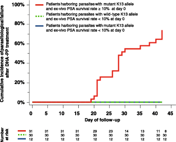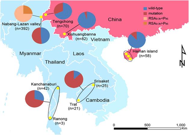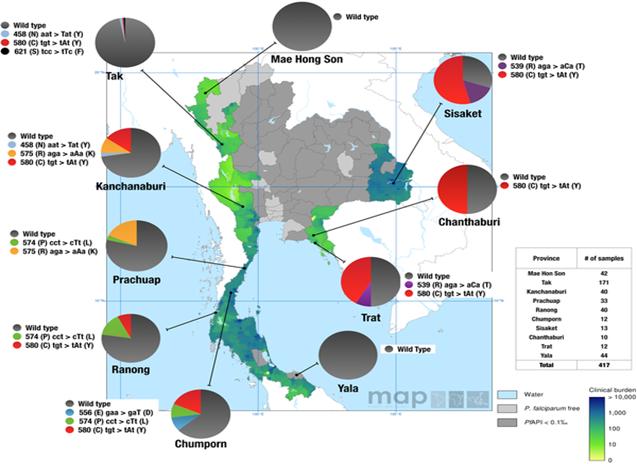 Khoảng hai phần ba các đột biến K13 được xác định được mô tả trước đây ở Myanmar hoặc tại biên giới Myanmar-Thái Lan và một nhóm nhỏ cũng đã được ghi nhận ở Campuchia. Những đột biến xác định trước đây có xu hướng phổ biến cao hơn những mẫu ở Myanmar, không mẫu nào trong số này được xác định trong hơn 10 mẫu được phân lập. Đã xác định được ba đột biến hiếm gặp (ba mẫu hoặc ít hơn) giống trình tự sau acid amin 210 trong số 759 mẫu từ Myanmar. Tính toán hệ số của tiến hóa trong một loài cho các giá trị từ 0,0123 cho dS và 0,0136 cho dN. Suy luận áp lực của chọn lọc từ các kết quả trong một loài dN cho tỷ lệ dS của 1,10 là thách thức, nhưng kết quả này là tương thích mạnh với các chọn lọc kháng đã ghi nhận. Tỷ lệ đột biến propeller K13 cho mỗi khu vực là tỷ lệ mẫu có bất kỳ đột biến vị trí sau acid amin 440. Nhập các số liệu thu được vào bản đồ cho thấy một khu vực rộng lớn có tỷ lệ đột biến khá cao (hơn 10%) kéo dài từ vùng đông nam đến phía bắc Myanmar. Phần lớn ở miền hạ Myanmar, các bang Rakhine và Chin ở phía tây có một tỷ lệ đột biến K13 rất thấp và điều này phù hợp với sự vắng mặt của đột biến K13 ở ký sinh trùng vùng cận với quốc gia Bangladesh. Phát hiện trong nghiên cứu này cung cấp bằng chứng chắc chắn rằng loài P. falciparum kháng artemisinin kéo dài và lan rộng khắp trên miền thượng Myanmar, bao gồm cả các khu vực biên giới ở phía tây bắc gần với Ấn Độ. So sánh với vùng hạ Myanmar và các bang phía tây (bang Rakhine và Chin) hiện đang có một tỷ lệ đột biến K13 tương đối thấp và không có bằng chứng về sự lây lan vào phía đông nam Bangladesh. Cũng không có bằng chứng cho thấy kháng artemisinin đã lan đến Ấn Độ, song rất ít dữ liệu có sẵn để đưa ra kết luận.