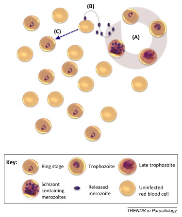 +Các HC nhiễm thấy tư dưỡng già và phân liệt trong lam giọt đặc, chúng không trương phình, các đặc điểm trên tuy riêng nhưng đôi khi tương tự các HC nhiễm P. malariae điển hình.
