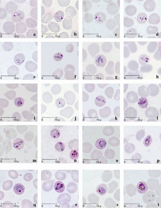 +Tỷ lệ nhìn thấy giao bào chỉ 1.2-2.8% số ca ghi nhận được trong số 10 ca được chọn ngẫu nhiên. Các giao bào trưởng thành đặc trưng hình cầu chiếm gần trọn hồng cầu, chấm chromatin đặc chắc và hạt pigment màu đen nâu, rải rác