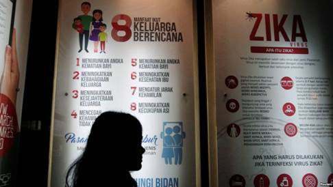 Một người phụ nữ đi qua một tấm áp phích giải thích về virus Zika tại văn phòng Bộ Y tế ở Jakarta, Indonesia, ngày 02/9/2016