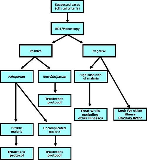 Kết quả của test chẩn đoán nhanh luôn luôn phiên giải đi theo các triệu chứng lâm sàng trên bệnh nhân và giải thích các sai lầm có thể của test. Dữ liệu thiết lập trên điều trị theo thuật toán và nhân viên y tế đào tạo để điều trị cho những ca SRAT hay nặng nghiêm trọng khi có sự có mặt KSTSR mà không chỉ ra trong kết quả test nhanh. Điều tra thêm tất cả các trường hợp xét nghiệm nhanh âm tính và khả năng bệnh lý khác không phải sốt rét gây các triệu chứng giống như sốt rét.