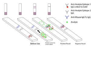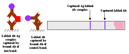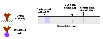 1.Kháng thể đánh dấu thuốc nhuộm, đặc hiệu với kháng nguyên đích, có mặt ở đoạn thấp của que nitrocellulose hoặc trong một giếng của test nhựa. Kháng thể cũng đặc hiệu với kháng nguyên đích được gắn với vạch nhỏ ở vùng vạch thử và hoặc kháng thể đặc hiệu với kháng thể đánh dấu hoặc kháng nguyên gắn với vạch chứng.