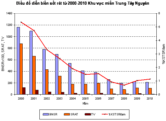 So sánh các chỉ số sốt rét khu vực miền Trung-Tây Nguyên trong vòng 5 năm gần đây thấy năm 2010 BNSR giảm 44.46% (so với 2006) và giảm 4.61% (so với 2009), SRAT giảm 42.43% (so với 2006) và giảm 3.54% (so với 2009), KSTSR giảm 25.97% (so với 2006) và tăng 10.68% (so với 2009), TVSR giảm 68% (so với 2006) và giảm 50% (so với 2009), đặc biệt số tử vong hạ xuống mức thấp nhất so với các năm trở lại đây.