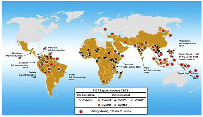 So với P. falciparum kháng CQ lần đầu tiên năm 1957 tại biên giới Colombia-Venezuela (Moore và cs., 1961) thì P. vivax kháng CQ muộn hơn và lần đầu tiên phát hiện tại Papua New Guinea. Về tính lan rộng của P. falciparum cũng nhanh hơn, sau khi kháng tại Papua New Guinea, tiếp đó là báo cáo P. falciparum kháng CQ năm 1959 ở biên giới Colombia-Venezuela (Peters và cs., 1960); biên giới Campuchia -Thái Lan (Harinasuta và cs., 1961); tại Cam Ranh, Khánh Hòa của Việt Nam (Powell và cs., 1963); từ đóP. falciparum tiếp tục kháng CQ ở mức độ cao và trên diện rộng hầu hết các quốc gia có SRLH. Trong vòng 20 năm, P. falciparum kháng CQ đã lan ra nhiều vùng Thái Lan và các nước Campuchia, Việt Nam, Lào; tới năm 1978-1987 đã xuất hiện kháng ở Kenya, Tanzania, Madagascar, Angola, Rwanda, Cameroon, Nigeria [77],[81].