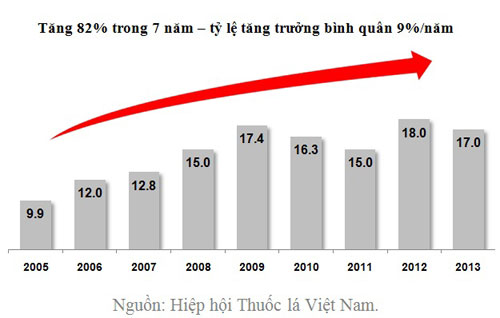 | Tỷ lệ tăng trưởng bình quân của ngành công nghiệp thuốc lá Việt Nam những năm gần đây không hề suy giảm |