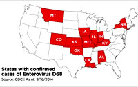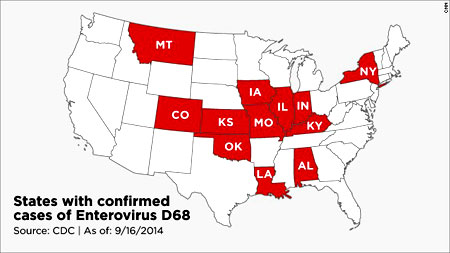 Ngày 17/9/2014. CNN - Số ca mắc Enterovirus D68 được xác nhận ở 12 bang của Hoa kỳ (12 states confirm Enterovirus D68 cases). Trung tâm kiểm soát và phòng ngừa dịch bệnh Hoa Kỳ (USCDC) đã xác nhận hơn 100 ca mắc Enterovirus D68 ở 12 bang của Mỹ bao gồm Alabama, Colorado, Illinois, Indiana, Iowa, Kansas, Kentucky, Louisiana, Missouri, Montana, New York và Oklahoma; tuy nhiên số ca thực mắc bệnh viêm đường hô hấp cấp gây ra bởi virus này có thể còn cao hơn.