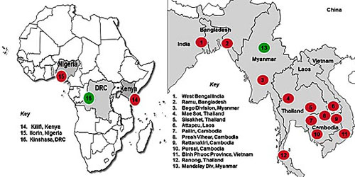 | Các vùng xác định P.falciparum kháng Artemisinine ở GMS và châu Phi |