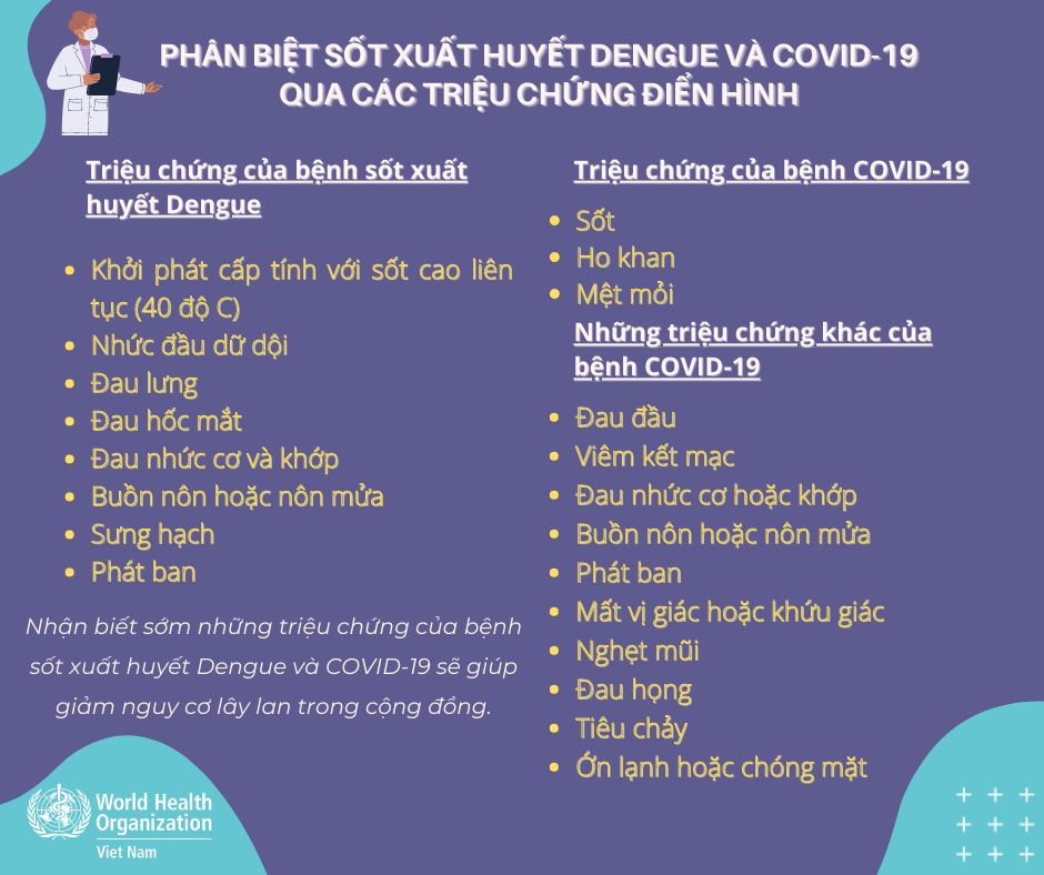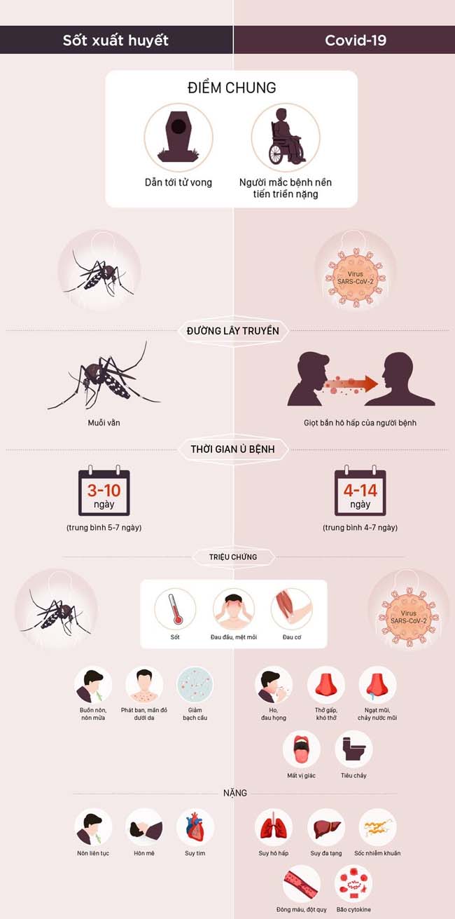 Sốt xuất huyết và COVID-19 đều là những căn bệnh truyền nhiễm do virus nguy hiểm dohai loại virus khác nhau gây ra. Tuy vậy, trong giai đoạn đầu, các triệu chứng của hai bệnh có thể bị nhầm lẫn với nhau trên người bệnh, nêu chậm chẩn đoán phân biệt có thể dẫn đến bệnh nhân chuyển biến nặng,dẫn đến nguy cơ tử vong, nhất là trong bối cảnh lưu hành dịch của hai bệnh xảy ra tại nhiều tỉnh thành.