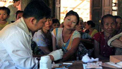Một nhân viên y tế lấy mẫu máu từ một người phụ nữ để xét nghiệm sốt rét trong hội trường thôn Ta Gay Laung