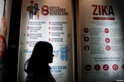 Một người phụ nữ đứng gần tấm áp phích giải thích virus Zika tại văn phòng của Bộ Y tế ở Jakarta, Indonesia, ngày 2/9/2016