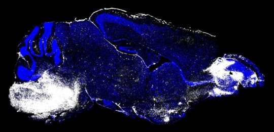 Hình ảnh cho thấy não của chuột mắc sốt rét thể não. Khu vực màu trắng (bên trái, cuống não và bên phải, khứu giác) chỉ ra các khu vực của chết tế bào thần kinh và sự rò rỉ của mạch máu (Credit: Image courtesy of Dorian McGavern, Ph.D., and Phillip Swanson II, Ph.D., NIH).